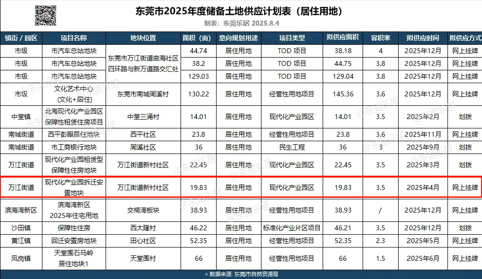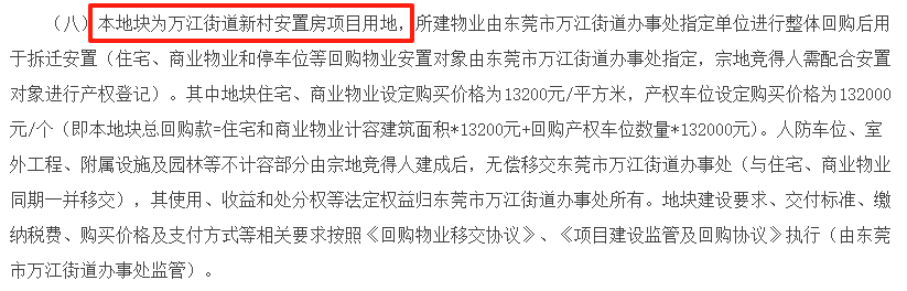 根据公告显示,该地块为万江街道新村安置房项目用地,所建物业由万江街道办事处指定单位进行整体回购后用于拆迁安置。