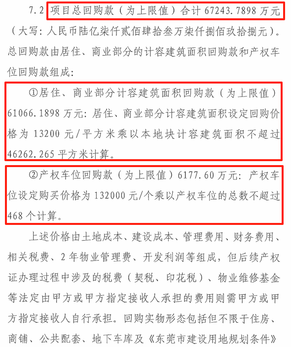 根据挂牌文件显示,该地块住宅和商业物业的政府收购价格已经确定为13200元/㎡,产权车位回购价13200元/个(不超过468个),项目总回购款最高合计约6.72亿元。